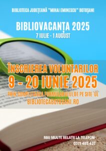 Biblioteca „Mihai Eminescu” din Botoșani a demarat înscrierile pentru corpul de voluntari din cadrul programului „BibloVacanța”. Acestea vor avea loc în în perioada 7 iulie – 1 august 2025. Programul estival al Bibliotecii a ajuns anul acesta la ediția cu numărul 15 și continuă tradiția verilor interactive la bibliotecă, printr-o ofertă diversificată de ateliere educative, creative și recreative, dedicate copiilor și adolescenților.
