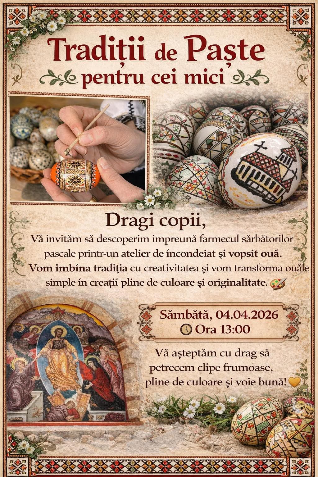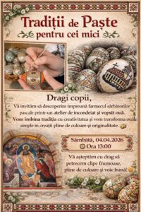 Pe 4 aprilie, în ajun de Florii, de la ora 13.00, Biserica Ortodoxă Roset va găzdui un atelier dedicat încondeierii și pictării ouălelor. Copiii care doresc să simtă bucuria pregătirilor sărbătorilor pascale sunt așteptați cu drag, intrarea fiind liberă.