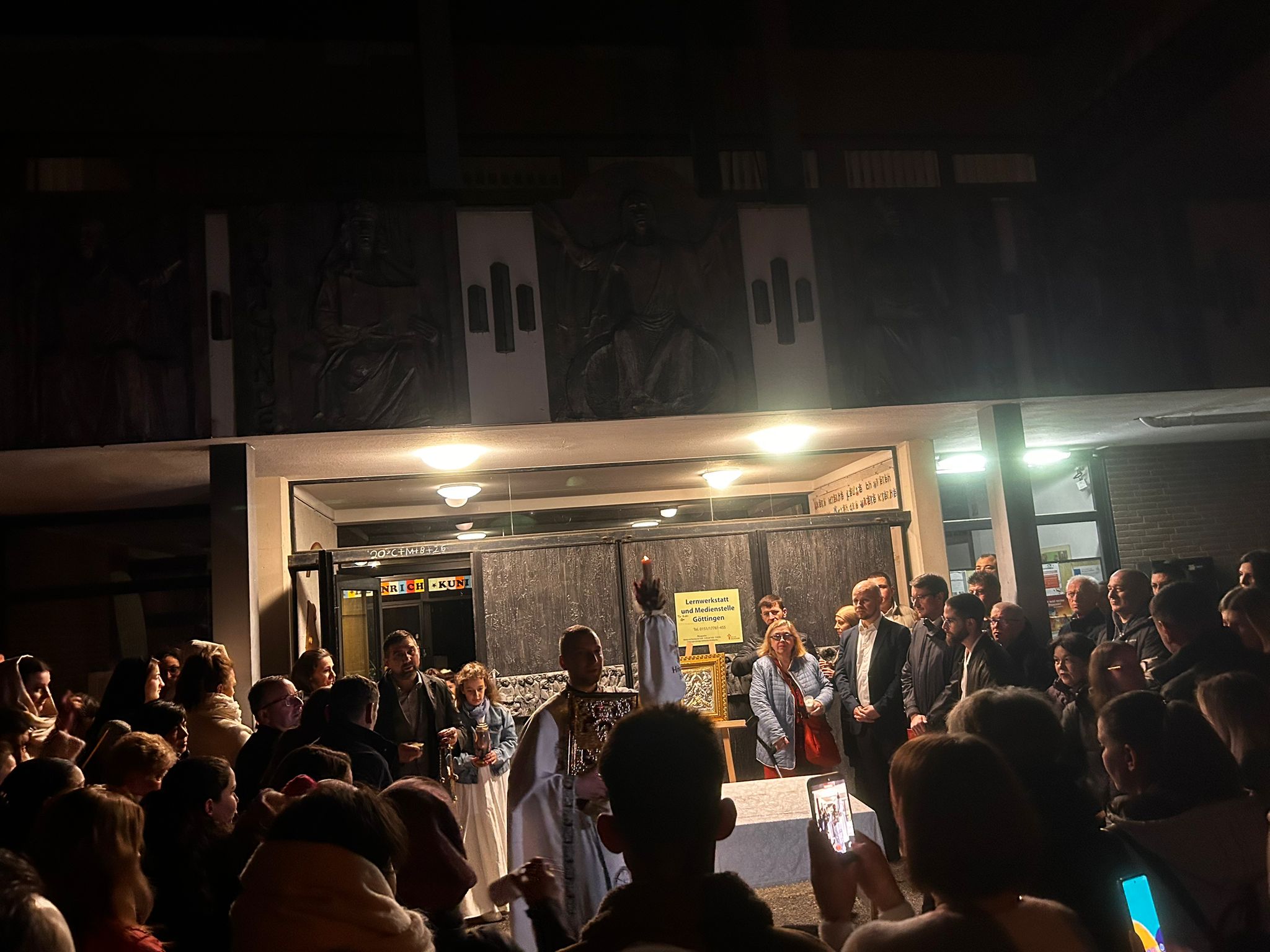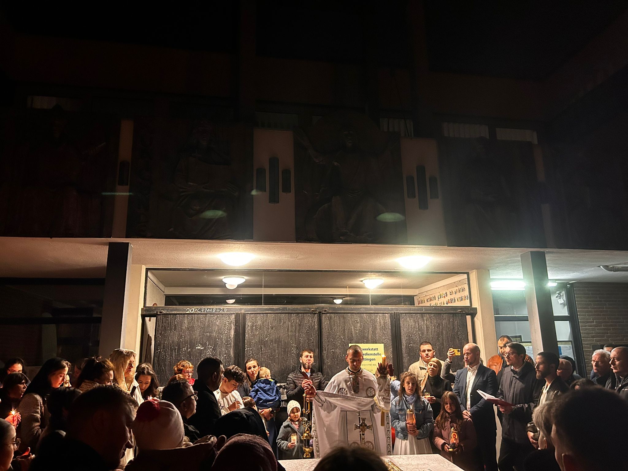 Și românii stabiliți dincolo de granițe au primit lumină în noaptea de Înviere. De pildă, la biserica creștin ortodoxă din orașul Gottingen Germania, un lăcaș mic care închiriază spațiul pentru slujbe de la o biserică catolică, au fost prezenți circa 200 de persoane, iar preotul a ținut slujba în limbile română și rusă pentru că erau și ruși acolo.